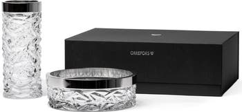 Presented in an elegant gift box, this set showcases a vase and a bowl with light-reflecting cuts of crystal and contrasting silver rims.