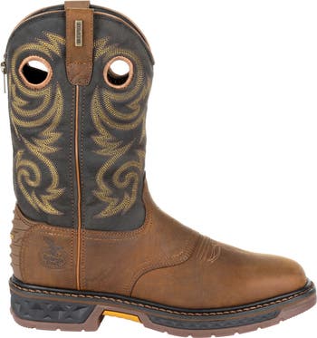 The Georgia Boot Carbo-Tec LT is built work boot tough with western style. The full-grain leather upper features a black fancy stitched shaft and brown saddle vamp with stitched toe bug. Reinforced pull holes and a rear zipper make pulling this western work boot on a simple task. The rear Counter Lock System prevents heel slippage for a secure fit and acts as a kick off for easy boot removal.Inside this waterproof western work boot you will find high performance mesh lining, the Georgia Waterproof System, and a removable Quick Response polyurethane insole.The durable outsole package starts with a thick EVA midsole that cushions as you move and absorbs shock. A fiberglass shank provides additional stability and support. The final layer of rubber delivers oil and slip-resistance, in addition to heat, and abrasion-resistance.