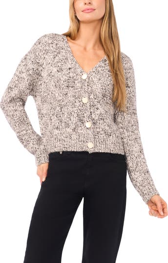 Polished golden buttons add an element of gleam to this V-neck cardigan that keeps things cozy knit from chunky, marled yarn that's kissed with wool.