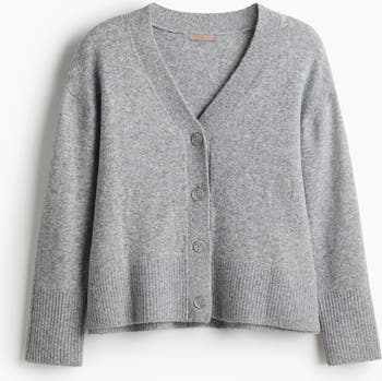 Cardigan in a soft knit containing some wool with a V-neck, buttons down the front, dropped shoulders and long sleeves. Ribbing around the neckline, down the button band and at the cuffs and hem.
