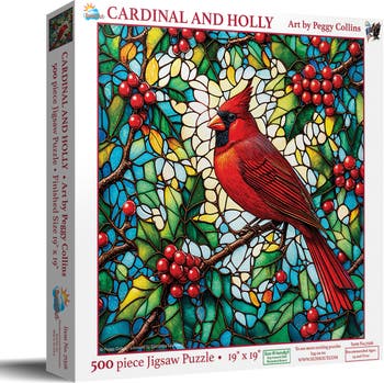 Cardinal and Holly 500 pc Jigsaw Puzzle by SunsOut- 500 Piece Jigsaw Puzzle - Completed Size: 19" x 19" - Puzzle Artist: Peggy Collins - SunsOut Puzzles are Proudly Made in the USA - Interlocking Pieces and Durable Construction: SunsOut jigsaw puzzles feature interlocking pieces that fit securely, making assembly easier and reducing frustration. Made with high-quality recycled cardboard, they are durable and to easy to work with - Warranty: SunsOut puzzles being made in the USA ensures high manufacturing standards include a worry-free guarantee ensuring any issues with missing or damaged pieces are resolved, reflecting SunsOut's commitment to quality and customer service. - Eco-Friendly Materials: SunsOut puzzles are crafted with eco-friendly materials