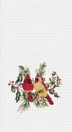 Say hello to the Cardinal Duo Berry Botanical Embroidered Waffle Weave Towel. Two loving cardinals in yellow and red perch atop a festive botanical branch, embroidered on a waffle weave cotton towel. Perfect for adding a splash of holiday cheer, no matter the season because it's never too early to start.