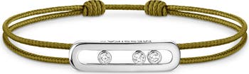 Pared-back lines bring modern elegance to a corded bracelet sparked with round-cut diamonds—three that move within the geometric border.