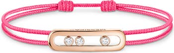 Pared-back lines bring modern elegance to a corded bracelet sparked with round-cut diamonds—three that move within the geometric border.