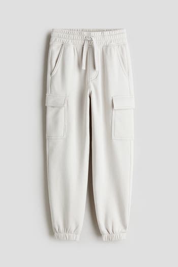 Cargo-style sweatpant joggers with soft, brushed inside. Decorative drawstring and covered elastic at waistband for added comfort. Diagonal side pockets, leg pockets with flap, and covered elastic at hems.