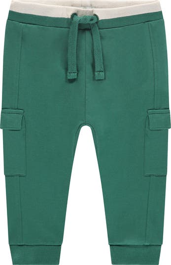This emerald green-toned pull-on jogger sweatpant features a contrasting cream-toned edge at the elastic drawstring waistband and cargo style pocket accents.