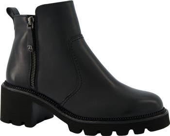 A chunky block heel and lugged sole define this modern leather bootie cushioned with an EVA footbed for comfortable all-day wear.