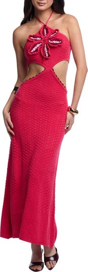 A bead-embellished crochet flower makes a statement at the bust of a cutout cover-up dress in a figure-hugging silhouette that's perfect for seaside dinners and dancing.