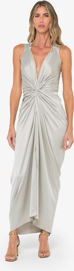 The Carla Dress in Satin Spandex is a showstopping silhouette designed to command attention. Crafted from a sleek, stretch satin, it features a deep plunging neckline that gathers into a dramatic front twist, creating a draped effect that flatters the figure.