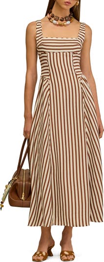 Cut with playful multidirectional stripes and diagonally piped seams, this breezy dress made with a touch of linen, wool and silk is fashioned with an open back bridged by a jumbo covered buckle.