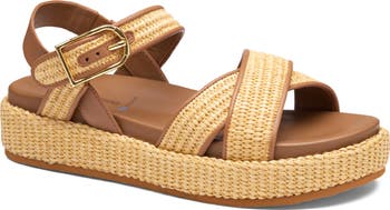 Finely woven raffia and smooth leather create textural interplay on a platform sandal featuring a foam-cushioned footbed and adjustable strap at the ankle.