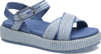 Finely woven raffia and smooth leather create textural interplay on a platform sandal featuring a foam-cushioned footbed and adjustable strap at the ankle.