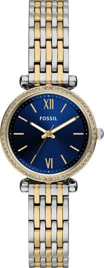 A crystal-set bezel upgrades the elegance of this Carlie watch, one of Fossil's timeless styles, while a polished two-tone stainless steel bracelet completes the look and ensures it pairs well with other accessories.