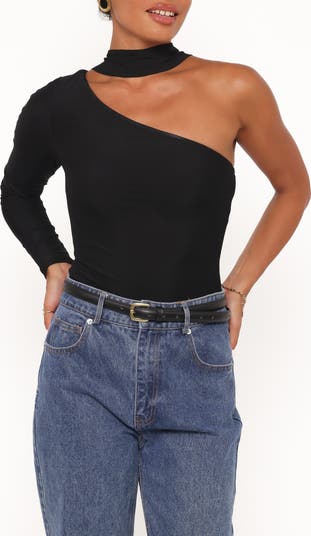 A one-shoulder mesh top features a curve-hugging silhouette and a scarf detail at the neck that elevates the entire look.