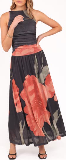 Strike an effortlessly charming note in this flowy midi dress designed with a clingy ruched bodice and a fluid skirt patterned in a large-scale floral print. A bateau neckline and softly gathered skirt keep the look breezy and versatile.