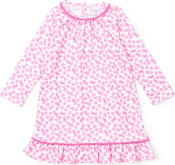 Long sleeve pima cotton dress with flutter ruffle hem and pom pom trim. Button closure at back of neck. Made from 100% Peruvian Cotton. This item is not intended for sleepwear.