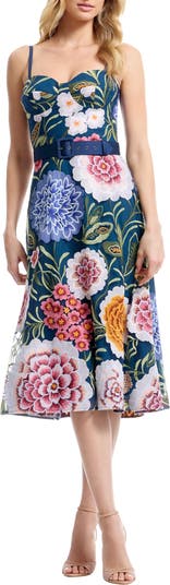 Carlita Belted Floral Embroidered Midi Cocktail Dress