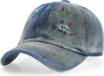 This denim baseball cap with contrast gold stitching is fitted with an adjustable back buckle strap and treated with a ripped and dirtied finish for a worn-in vintage look.