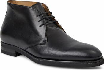 Burnished midgrain leather transforms a classic chukka boot into an elevated footwear staple that smartens any going-out look. A plain toe and three-hole derby lacing preserve the traditional chukka detailing to maintain a crisp, clean profile.