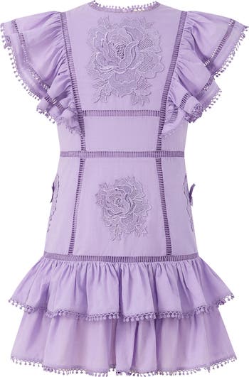 The Carolyn Frill Cotton Mini Dress is a beautifully detailed style featuring delicate embroidered motifs, flutter sleeves, and playful frill tiers. Crafted in a soft lavender hue, this dress blends whimsical charm with timeless Marlo elegance — perfect for birthdays, celebrations, and sunny days.