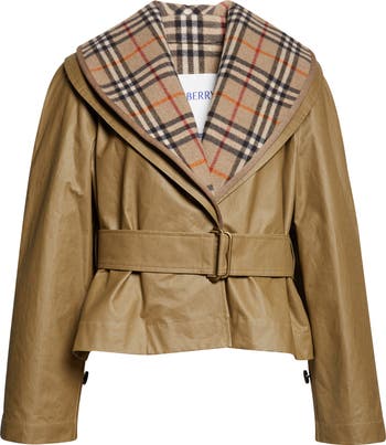 Double your outerwear options with this waxed-cotton wrap jacket cinched with a B-buckle belt and designed with a removable House Check wool liner jacket with an oversized shawl collar.