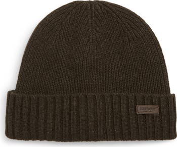 A logo-embossed leather patch brands the ribbed cuff of a wool-blend beanie with a cozy fleece lining.