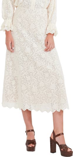 Drawing inspiration from iconic skirt silhouettes seen in the Edwardian era- The Carly Midi Skirt features a high waist, an A-line silhouette that flows along the body. Crafted in ivory hand-crocheted lace. The ankle-grazing hemline is trimmed with scallop lace for a final touch of romance. An invisible side zipper with a hook-and-eye closure creates the perfect fit.