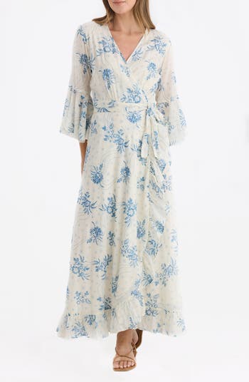 Delightful blooms enhance the enchantment of this luscious chiffon maxi made in a figure-skimming wrapped silhouette and framed by flouncy frilled sleeves.