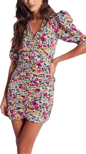 Floral mini dress with a V-neckline, front and back ruching, and puff sleeves.