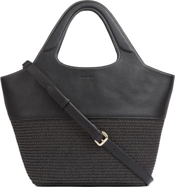 Smooth faux leather and finely woven straw create textural interplay on a mixed-media shoulder bag designed with a spacious interior and optional crossbody strap for hands-free wear.