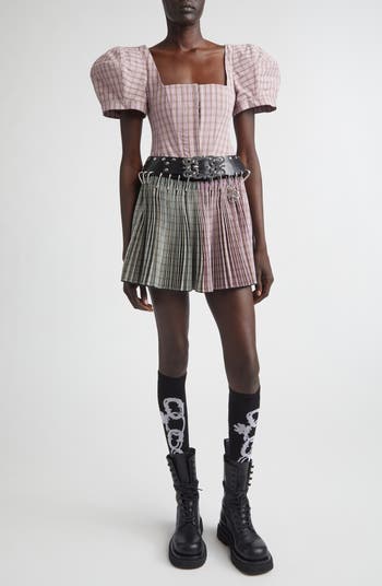 The design duo's schoolcore-inspired influences shine through the razor-sharp knife pleats and mixed plaid of this buxom minidress finished with playfully puffed sleeves and a boned corset bodice. A studded leather belt and the label's signature carabiner clips bring bold hardware shine to your look.