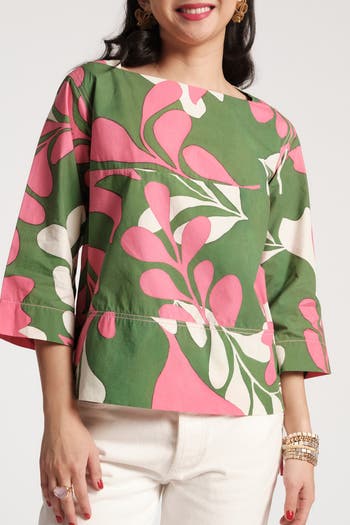 A soft lightweight material top featuring a boat neckline|bracelet-length sleeves|zippered side seams|Designed with a straight cut|a fitted seam above the chest| slight dropped shoulders| two pockets|contrast stitching