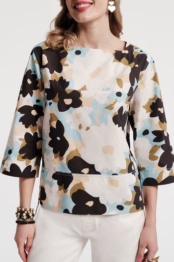 A soft lightweight material top featuring a boat neckline| bracelet-length sleeves| zippered side seams| Designed with a straight cut| a fitted seam above the chest|slight dropped shoulders|two pockets|contrast stitching