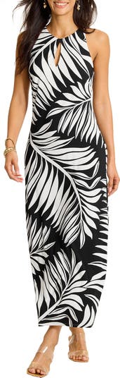 This sleeveless maxi dress makes a bold impression with a tropical botanical print in crisp white against a black backdrop. Cut in a straight fit that skims the body, it features a keyhole neckline, built-in snaps that conceal bra straps, and fabric with a hint of stretch for comfort. Wrinkle-resistant fabric offers UPF 30 protection, so you'll be ready for whatever the day holds in store.