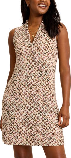An allover geo print pops on this figure-skimming mini made with a kiss of comfortable stretch and trimmed with fanciful neckline frills.