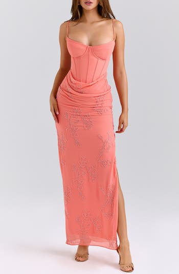 Intricate hand-beaded embellishments elevate this figure-sculpting gown cut from luxe georgette. A shapely corseted bodice and daring side slit further the sultry attitude of this evening-out look.