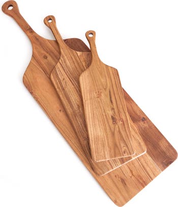 Charcuterie anyone? These serving boards are food safe and ready to dazzle your guests. Made of a solid acacia wood, they are as sturdy as they are beautiful. The only thing missing is your culinary creations!