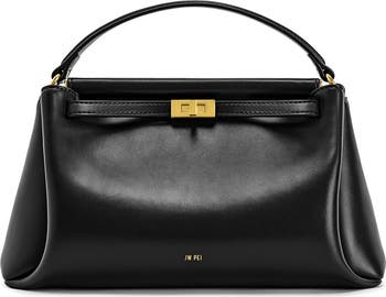 Glinting turnlock hardware highlight the structured profile and smooth leather exterior of an everyday bag featuring a divided interior and optional shoulder strap for on-the-go convenience.
