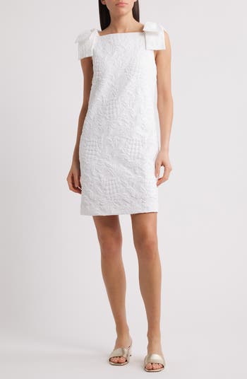 A dimensional pineapple motif rendered in puckered jacquard textures this sleeveless shift topped with prominent bows.