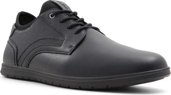 Mixed textures and a socklike collar add modern elements to a leather derby grounded by a textured sole for durability.