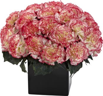 One of the more common “decorating” flowers is the carnation, and one look shows you why it’s such a favorite. The full blooms are nothing short of magnificent, making a rounded “pillow” of natural beauty. This offering captures that look perfectly with the included black ceramic planter. Never needing water, this arrangement will adorn your home or office for years to come.