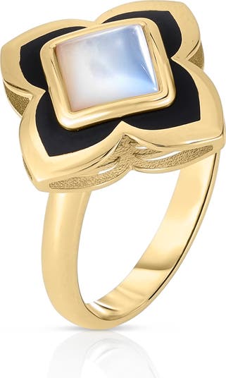 A luminous mother-of-pearl center glows from the flower-shaped setting on this beautiful ring cast in 18-karat gold.