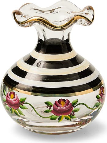 Display your favorite flowers in exquisite style with this glass vase that features a fluted rim and hand-painted body showcasing Courtly Stripes, pink flower buds and gold luster trim.