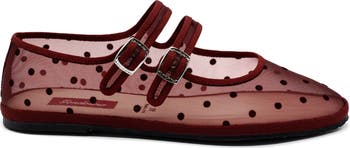 Step into Italian elegance with the Gondolina Carnival Mary Jane Double Strap Flats, crafted in luminous mesh embroidered with delicate burgundy dots. Meticulous artisan stitching and a slightly deeper neckline create a refined and sophisticated silhouette, showcasing timeless Italian style. Designed for all-day wear, the lightweight, breathable construction ensures comfort without compromising elegance, while sustainable materials reflect slow-fashion intimacy and expert craftsmanship.