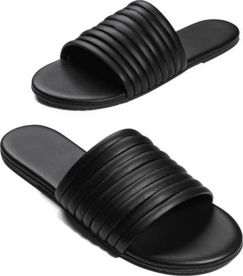 A wide strap hugs your foot like a glove on this leather slide sandal set on a cushioned footbed for even more comfort.