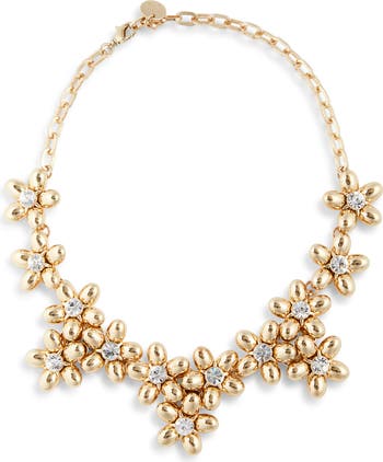 This stunning statement necklace is inspired by a pair of vintage earrings and sculpted in a bulbous bloom of gilded flowers embellished with crystals.