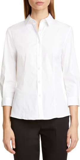 The wardrobe-staple poplin button-down is stylishly updated with pleated sleeves that are embroidered with Carolina Herrera's monogram.