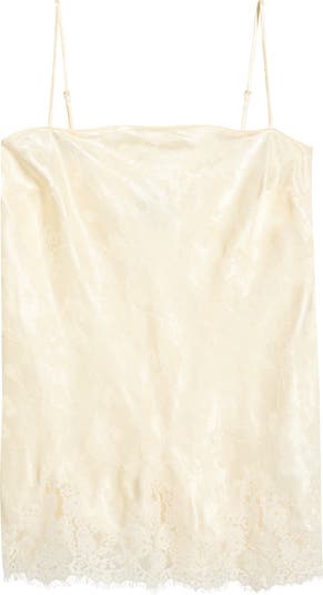 A dimensional jacquard pattern textures this lace-trimmed satin camisole that's perfect for layering.