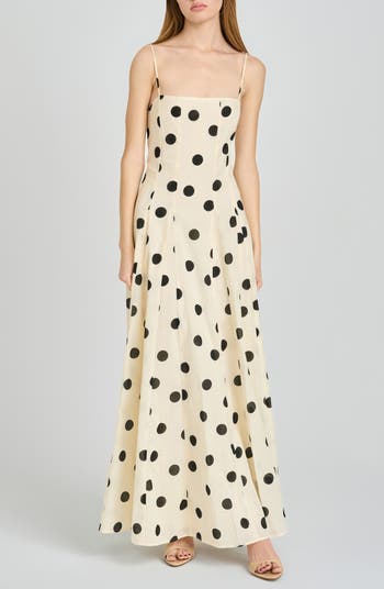 Triangular godets bring beautiful flare to this dot-dappled cotton maxi dress fashioned with an open back and adjustable straps.