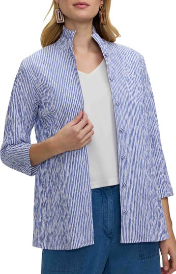 Classic stripes enrich a crinkle-jacquard shirt punctuated by a ruffled stand collar and a longline silhouette.